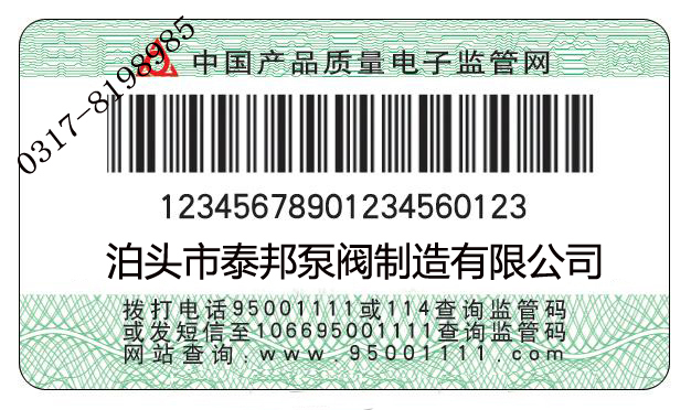 泊頭市泰邦泵閥制造有限公司自2006年12月1 日出廠的產品,在產品合格證上粘貼長方圓形監(jiān)管碼標簽,上有20位數字,這就是產品監(jiān)管碼。因此,我公司生產的每件產品都將有一個“電子身份證”??梢岳霉潭娫?、手機短信、互聯網、超市終端等網絡通訊設備對電子監(jiān)管碼進行查詢,辨別真?zhèn)巍2樵冝k法如下: 1. 電話查詢: